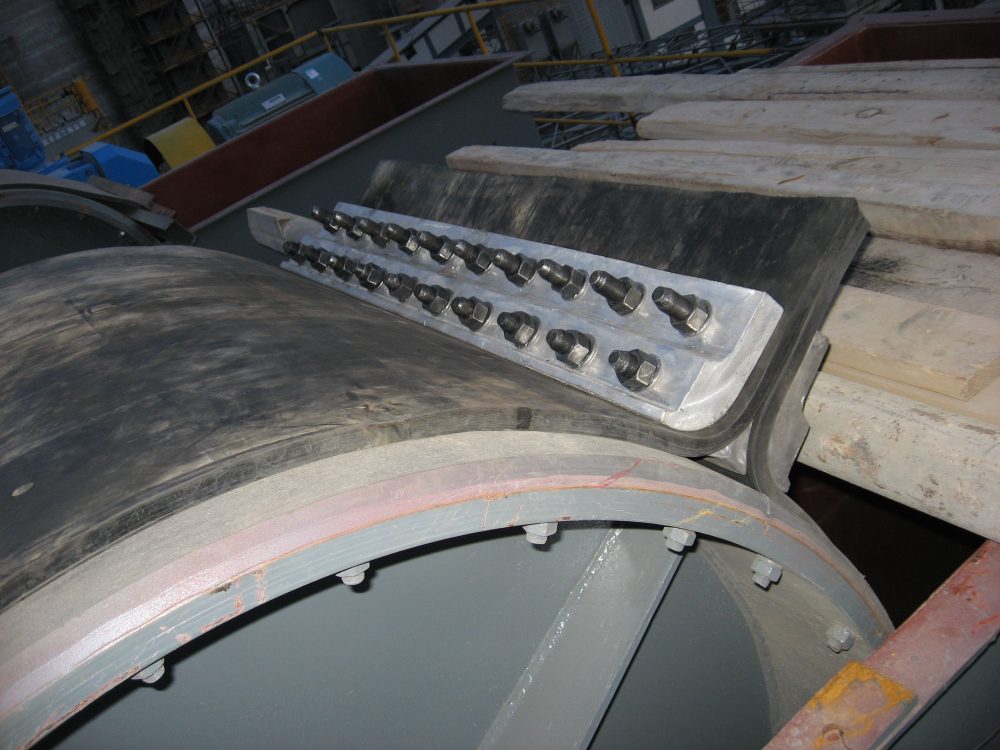 斗提升機(jī)輸送帶為條帶狀結(jié)構(gòu),裝配時需要采用夾具,將膠帶的兩個端部連接固定成為環(huán)狀,實(shí)現(xiàn)在滾筒帶動下連續(xù)運(yùn)行。