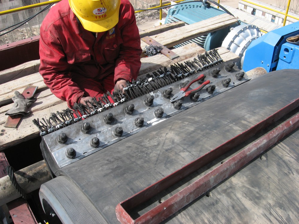 斗提機輸送帶伸長小,輸送量大,運行平穩(wěn),維護方便,對塊狀物料適應性良好。這種專用膠帶在厚度、鋼絲密度、經(jīng)緯布置、鋼絲粗細等方面與傳統(tǒng)鋼絲膠帶完全不同。此種膠帶在縱、橫兩向組成鋼質(zhì)骨架,因此可保證料斗的安全連接和載荷均衡分布。膠帶采用機械打孔,出廠前孔已打妥。使用效果表明,這種專用鋼絲膠帶完全滿足了大輸送量、超高提升的使用要求。